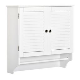 Cette armoire haute murale de salle de bain ou WC dotée d'un placard 2 portes persiennes avec étagère et porte-serviette vous permettra de ranger vos produits d'entretien, de beauté, votre papier hygiénique, etc.Caractéristiques :- Style altique avec portes persiennes et corniche supérieure pour plu