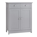 Meuble bas de salle de bain sur pied 2 portes avec étagère réglable 2 tiroirs poignées boutons métal MDF gris