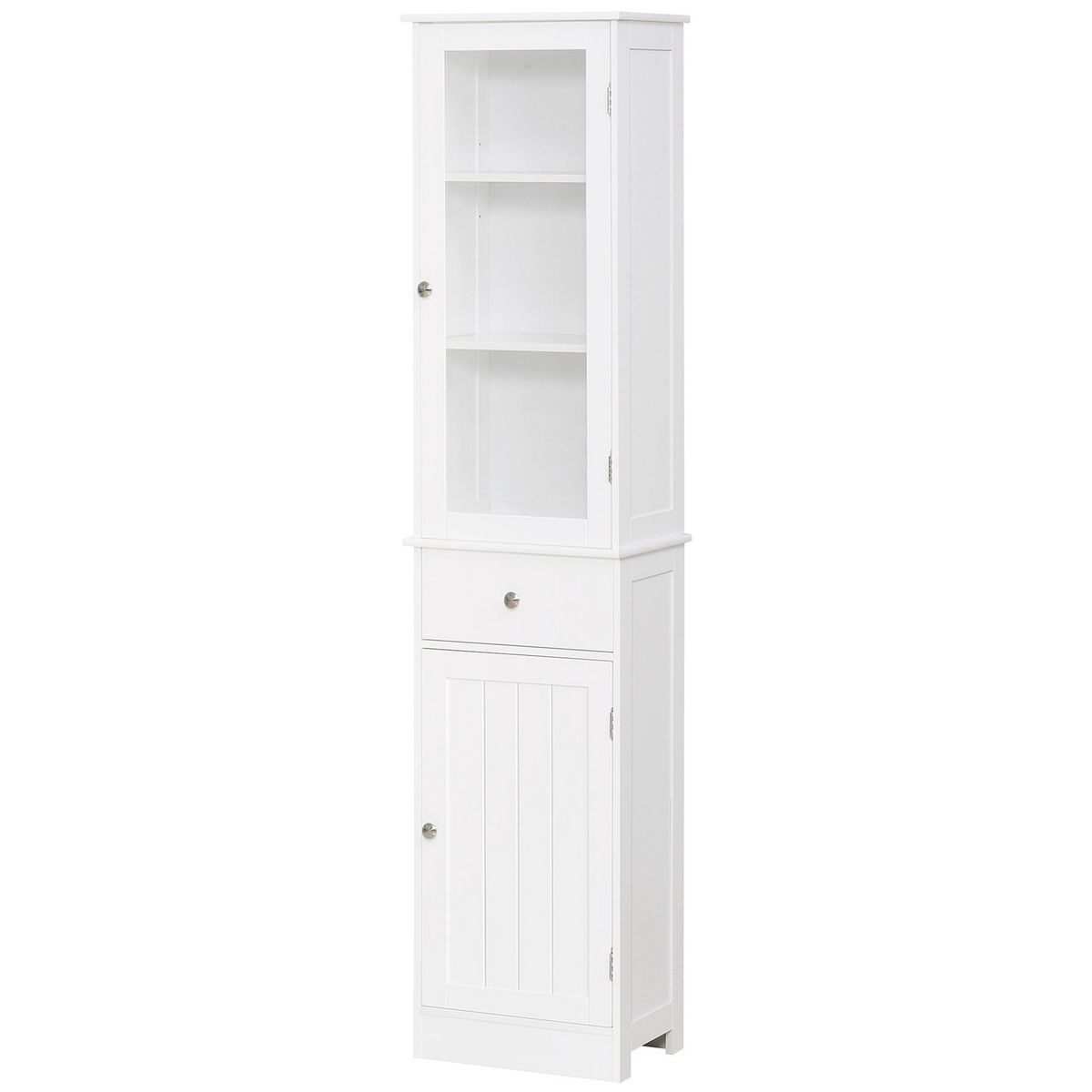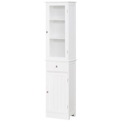 - Meuble colonne multi-rangements composé d'un placard avec porte acrylique comprenant 2 étagères, d'un placard porte doté d'une étagère, et tiroir coulissant