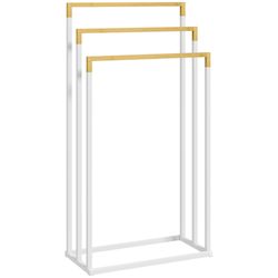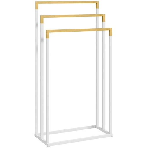 - Porte-serviette autoportant 3 barres en acier blanc et bambou : touche naturelle et épurée qui saura se marier à votre déco