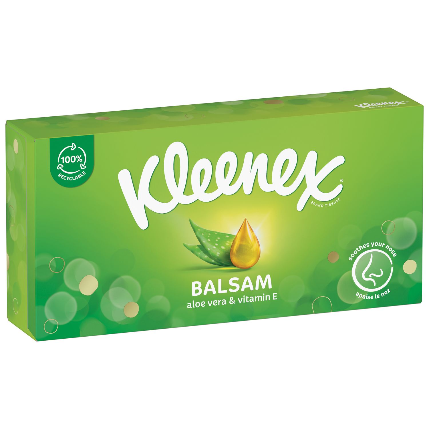 Kleenex® Balsam est le compagnon idéal de votre hiver ! S'il est facile d'attraper un rhume, il est souvent difficile de s'en débarrasser. Avec son baume protecteur, Kleenex® Balsam est le mouchoir apaisant idéal en cas de gros rhumes* (*vs Kleenex® The Original). Son baume protecteur 3 en 1 enrichi au calendula, à l'aloé vera et à la vitamine E apaise, nourrit et protège votre nez et votre peau des irritations. Ces mouchoirs sont testés dermatologiquement et conviennent aux peaux les plus sensibles. Avec Kleenex® Balsam, affrontez l’hiver en toute sérénité ! Également disponible en format étuis / Mouchoirs en papier fabriqués en France / Mouchoirs en papier certifiés FSC (Forest Stewardship Council)