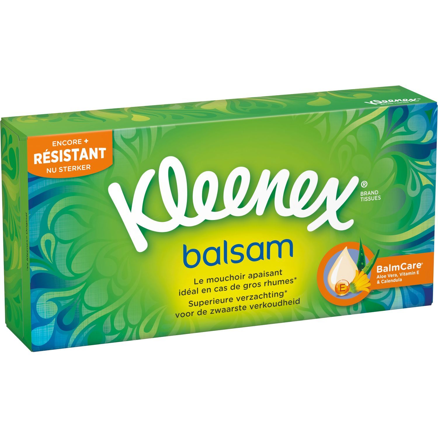 Kleenex ® Boite Balsam x1 Kleenex® Balsam est le compagnon idéal de votre hiver ! S'il est facile d'attraper un rhume, il est souvent difficile de s'en débarrasser. Avec son baume protecteur, Kleenex® Balsam est le mouchoir apaisant idéal en cas de gros rhumes* (*vs Kleenex® The Original). Son baume protecteur 3 en 1 enrichi au calendula, à l'aloé vera et à la vitamine E apaise, nourrit et protège votre nez et votre peau des irritations. Ces mouchoirs sont testés dermatologiquement et conviennent aux peaux les plus sensibles. Avec Kleenex® Balsam, affrontez l’hiver en toute sérénité ! Également disponible en format étuis ouchoirs en papier fabriqués en France ouchoirs en papier certifiés FSC (Forest Stewardship Council)