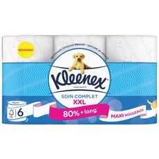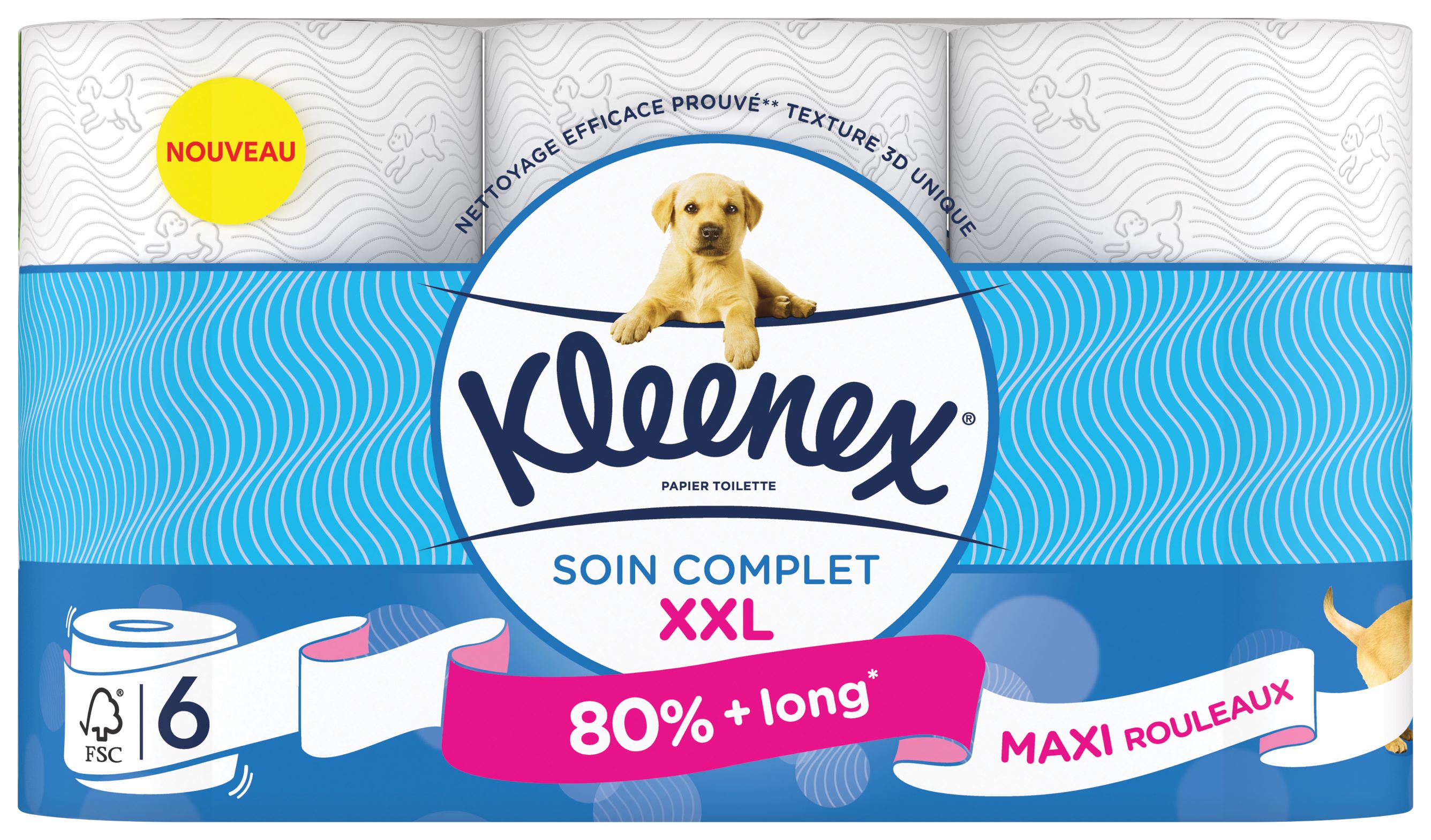 Kleenex® Soin Complet XXL bénéficie d’une double épaisseur et d’une texture 3D unique, pour un nettoyage efficace en toute confiance. Des rouleaux 80% plus longs et 37% d’emballages en moins (comparé à Soin Complet Classique). Notre gamme est certifi