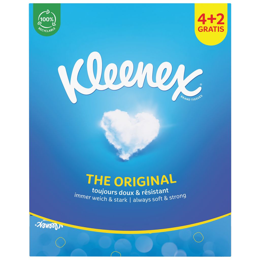 Kleenex® The Original est le mouchoir emblématique de la marque et qui vous accompagne dans tous les moments de la journée. Avec son format en lot de 6 boîtes, vous pourrez les placer dans différentes pièces de la maison pour que vous soyez toujours équipés ! Ce mouchoir allie à la fois douceur et résistance et vous assure un confort optimal. Avec une touche de soie naturelle, il vous permet d’affronter le quotidien avec douceur. Kleenex® The Original, votre allié au quotidien ! Également disponible en format étuis / Mouchoirs en papier fabriqués en France / Mouchoirs en papier certifiés FSC (Forest Stewardship Council)