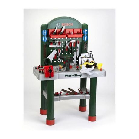Cet établi Work-Shop BOSCH est idéal pour apprendre a bricoler comme les grands ! Il comporte : un large plan de travail, une étagere et deux casiers de rangement, un étau, des crochets pour suspendre les outils. Livré avec accessoires : visseuse avec embouts, un véhicule a monter, outils réalistes,