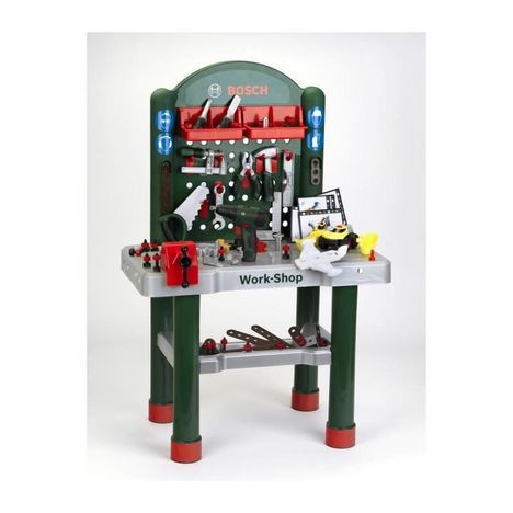 Cet établi Work-Shop BOSCH est idéal pour apprendre a bricoler comme les grands ! Il comporte : un large plan de travail, une étagere et deux casiers de rangement, un étau, des crochets pour suspendre les outils. Livré avec accessoires : visseuse avec embouts, un véhicule a monter, outils réalistes, lattes, vis et écrous.