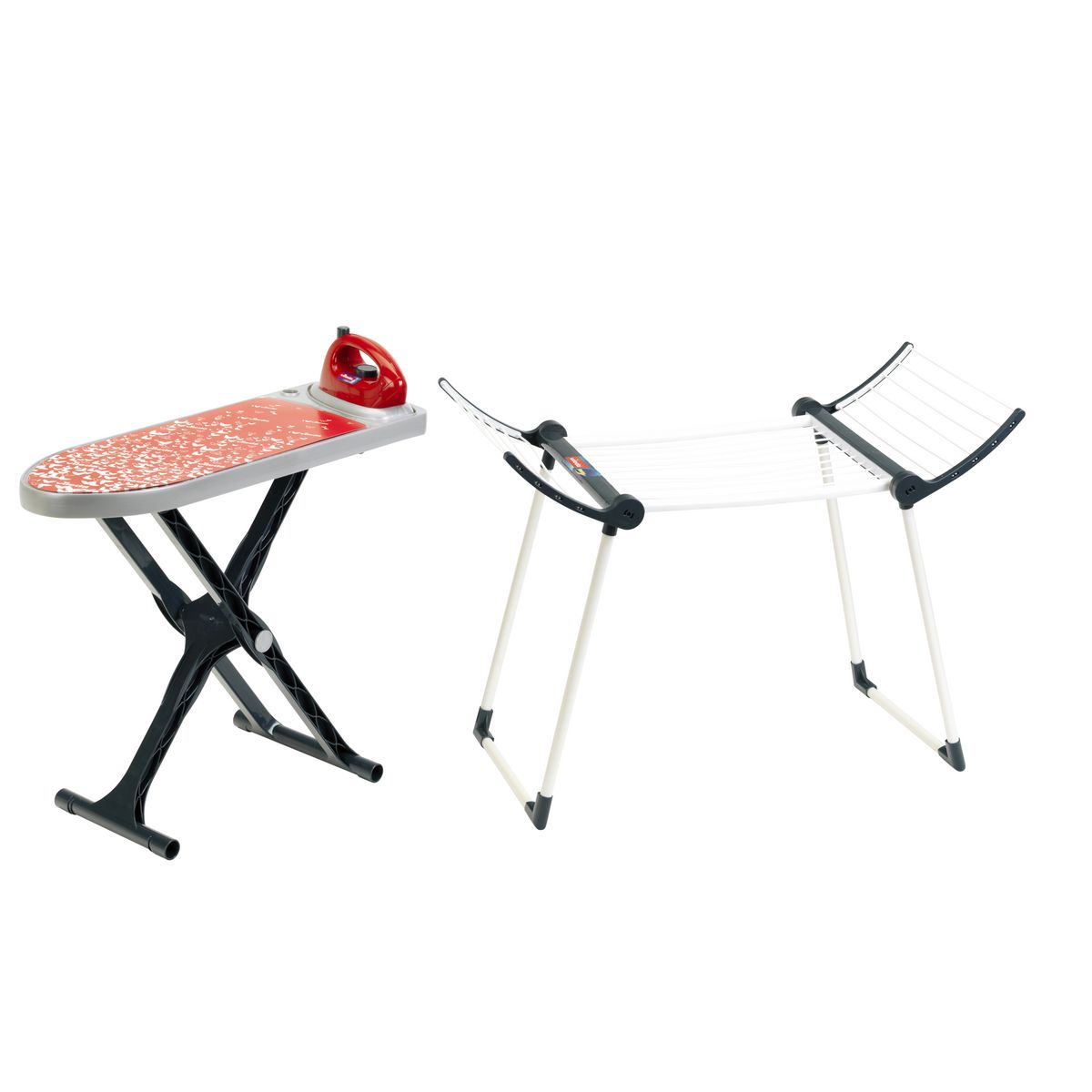 Cet ensemble de buanderie sous licence VILEDA comprend un étendoir pliable (dimensions : 65 x 33 x 49,5 cm) Une planche à repasser réglable en hauteur (dimensions : 60 x 20 x 47 cm ou 60 x 20 x 52 cm) ainsi qu'un fer à repasser.