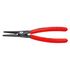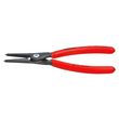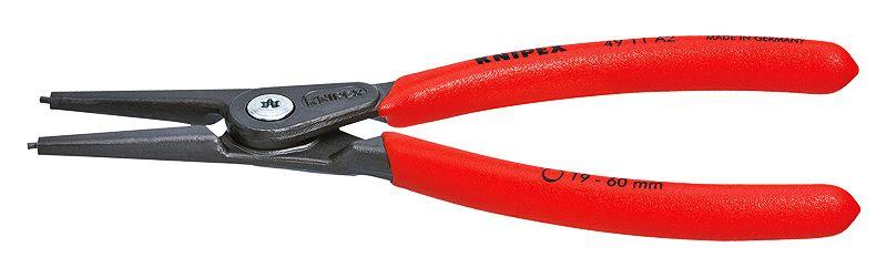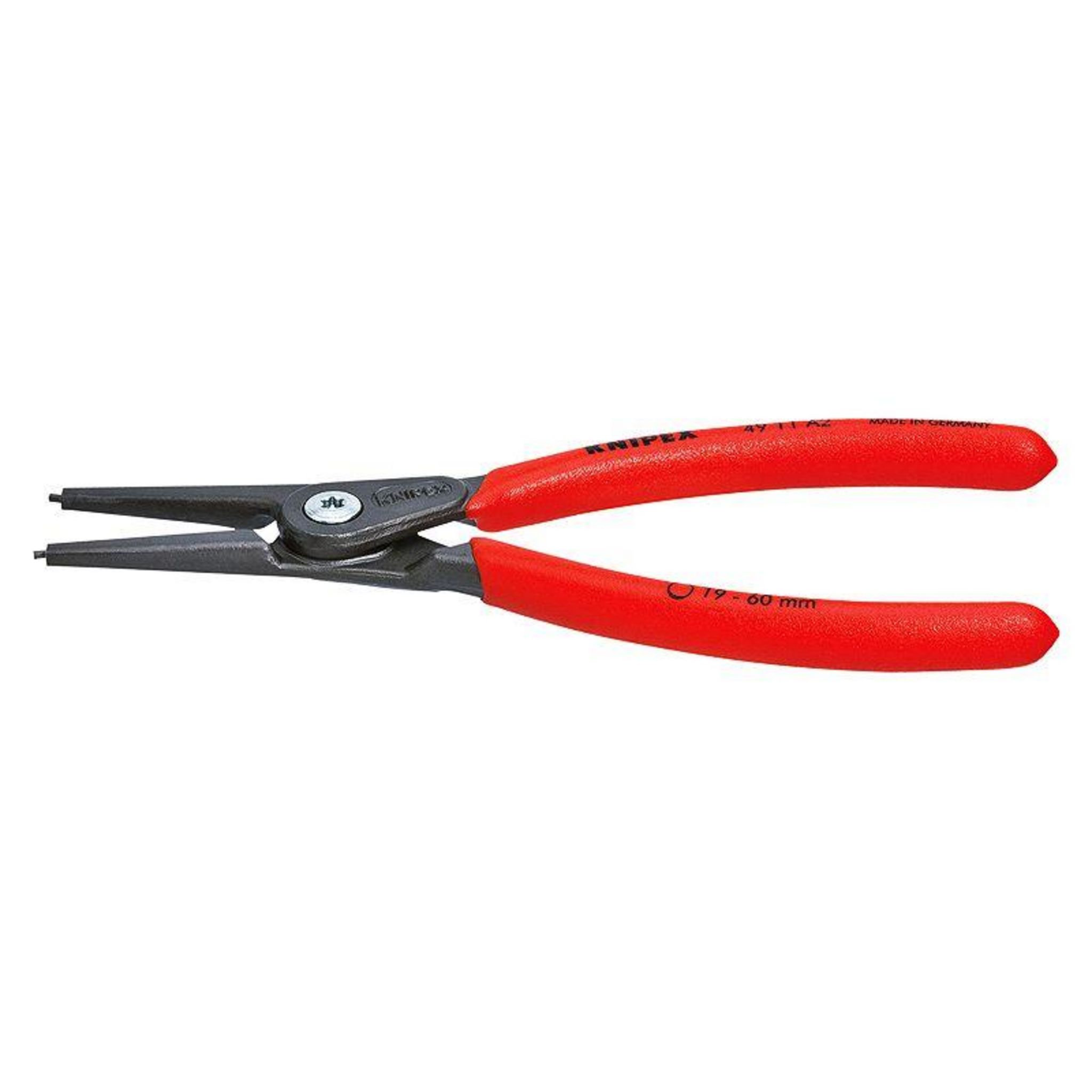 Pointes parfaitement rapportées et serties en acier à ressort hautement compressé, fournissent une grande sécurité contre la surcharge. Vaste surface de contact et position des pointes empêchant la distorsion et le glissement des circlips pour un montage facile. Durée de vie jusqu'à 10 fois plus longue que des pointes usinées au tour. Charnière vissée pour un mouvement de la pince précis et sans jeu. Ressort d'ouverture imperdable et protégé intégré dans la charnière. Poignées revêtues d'un gainage plastique antidérapant. Corps de la pince acier électrique au chrome-vanadium, forgé, trempé à l'huile.