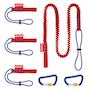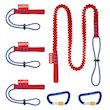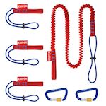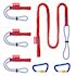 Système de sécurisation d'outils offrant une multitude de possibilités d'utilisation : bâtiment, génie civil, cordiste, escalade industrielle, etc. Permet une protection fiable contre les chutes afin d'éviter les blessures graves, les dommages matériels et la perte d&rsquo,outils. Le set contient 1 longe, 2 mousquetons et 3 adaptateurs.La longe est équipée d'une sangle plate cousue à une extrémité, et d'un cordon avec stoppeur à l'autre extrémité. Elle est souple et étirable jusqu'à 1,50 m afin de permettre une utilisation aisée sur un grand rayon de travail. Les mousquetons en aluminium robustes et légers sont verrouillables par molettes pour éviter les ouvertures inopinées et un cran d'arrêt renforce leur résistance à la traction. Ils permettent de relier les adaptateurs et la longe, ou de les fixer à un point d'ancrage. Les adaptateurs sont conçus pour passer rapidement de la fixation sur la sacoche à la longe, ainsi que d'un outil à un autre.