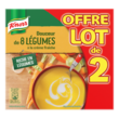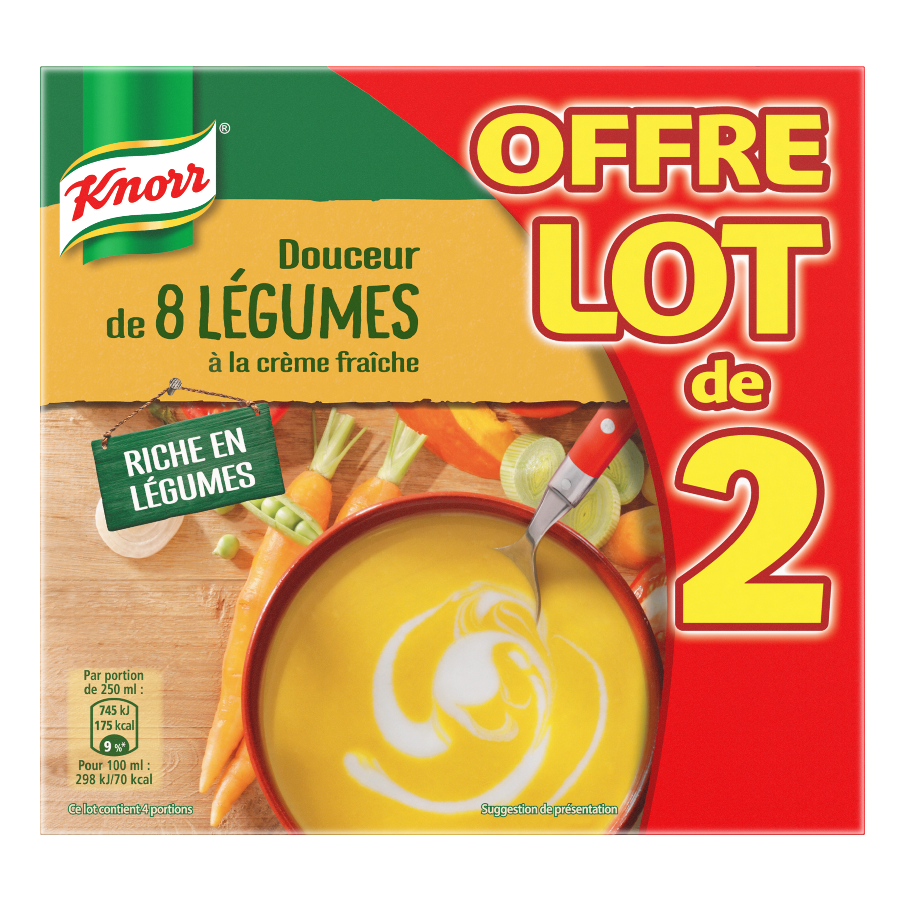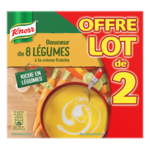 NOTRE RECETTE Ingrédients : eau, carotte¹ : 15 %, tomate¹ : 11 %, pomme de terre¹ : 5,2 %, courge¹ : 3,2 %, oignon¹ : 3,1 %, CRÈME fraîche : 3 %, huiles végétales (tournesol, colza totalement hydrogénée), amidon modifié de maïs, poireau¹ : 1,8 %, sucre, BEURRE, CÉLERI-RAVE¹ : 0,9 %, petit pois¹ : 0,9 %, sel, lactosérum (LAIT), graisse de poule, arôme, extrait de levure, LAIT en poudre écrémé, ail. Peut contenir : gluten, moutarde, œuf, soja. ¹Légumes issus de l'agriculture durable. Teneur en légumes¹ : 41,1 %.