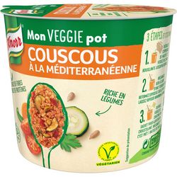 Optez pour Mon VEGGIE Pot Couscous à la Méditerranéenne Knorr®, empreinte des saveurs méridionales, à base de semoule, de délicieux morceaux de légumes, d’épices, de graines de tournesol et de croûtons. Versez de l'eau bouillante jusqu’au repère, attendez 5 min et votre Veggie Pot Knorr® est prêt ! Cette recette végétarienne est sans colorant sans conservateur ni exhausteur de goût. Envie de plus de recettes végétariennes ? Laissez-vous tenter par les autres Veggie Pot Knorr® Penne Primavera, Riz à la Mexicaine, Riz & Quinoa façon Curry Vert Thaï, Boulghour à l'Orientale et Lentilles & Riz façon Dal Indien ! Pour encore plus de plats express, découvrez toutes nos autres gammes de pots Knorr® : - Mon PASTA Pot, pour des recettes simples et intemporelles à base de pâtes. - Mon RICE Pot, pour varier les plaisirs avec de délicieuses recettes à base de riz. - Mon ASIAN Pot, pour une touche d’exotisme avec des recettes asiatiques authentiques. Le saviez-vous ? L’histoire de Knorr® débute en 1838, lorsqu’un visionnaire entrepreneur nommé Carl Heinrich Knorr ouvre une usine dont l’activité consiste à fournir de la chicorée aux fabricants de café. Il commence alors à faire des expériences sur la déshydratation des légumes et des assaisonnements afin de préserver leur saveur. C’est ainsi que furent lancées en 1873 les premières soupes déshydratées Knorr®. Une découverte qui a ouvert la voie du progrès, faisant de Knorr® une marque innovante reconnue dans le monde entier pour son esprit pionnier. Aujourd’hui encore, nous mettons tout en œuvre pour faire ressortir les meilleures saveurs de nos ingrédients tout en honorant les cuisines du monde. Notre amour pour la cuisine est notre force. Plat Préparé Déshydraté