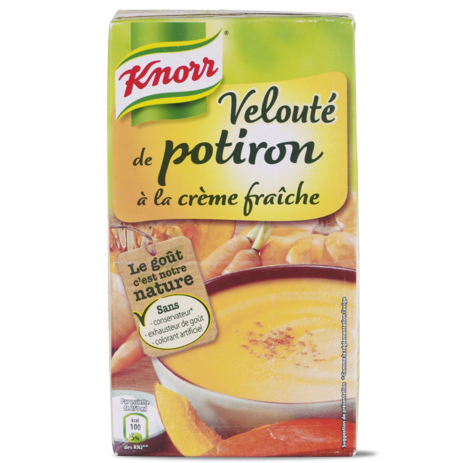 légumes  53% (potiron²  29%, carotte², oignon², pomme de terre, tomate²), eau, CRÈME fraîche  1,6%, BEURRE, sel, sucre, extrait de levure, arômes naturels (dont LAIT). Peut contenir  blé, céleri, œuf. ²légumes issus de l'agriculture durable.