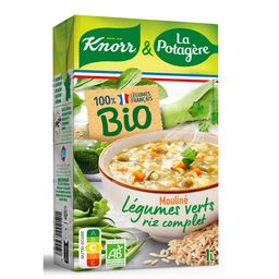 Eau, pommes de terre*, courgettes* 7%, poireaux* 6,6%, oignons*, haricots verts* 4,4%, carottes*, céleri-rave*, épinards* 3%, riz complet* 3%, beurre*, huile d'olive vierge extra*, sel, ail*, thym*, basilic*, curcuma*, poivre*, laurier*. Peut contenir des traces éventuelles de gluten * Ingrédient issu de l'agriculture biologique.