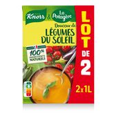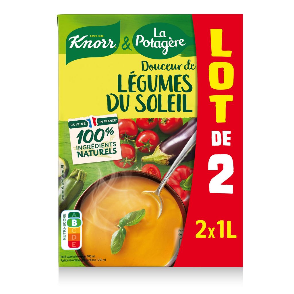 Notre soupe Knorr & La Potagère associe le bon goût des légumes gorgés de soleil avec du poivron, de la courgette et de l'aubergine. Une pointe de crème fraîche crée une recette gourmande et conviviale. Notre soupe est cuisinée près de Brest en Bretagne avec des ingrédients 100% d'origine naturelle. Le format 2x1L est idéal pour une consommation familiale, économique et pratique.