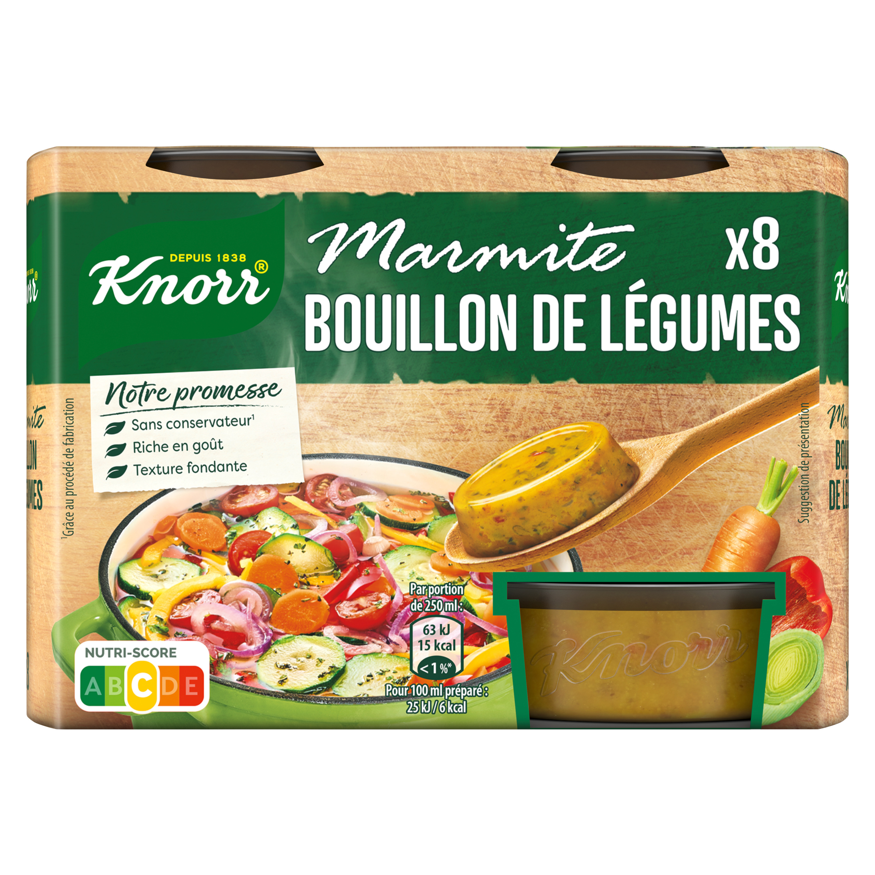 Découvrez la gamme Marmite Bouillon Knorr®, une gamme de bouillons riche en goût et à la texture fondante, idéale pour vos poêlées. La Marmite Bouillon de Légumes Knorr® est votre allié du quotidien pour sublimer les poêlées, woks de légumes, risottos, soupes maison ou encore vos pâtes et riz ! Ce bouillon légumes est sans conservateur, sans colorant et sans exhausteur de goût. Découvrez-le sous son format 8 marmites. Un allié du quotidien pratique grâce à sa texture fondante : Dilluez 1 marmite dans 500 ml d'eau ou intégrez votre Marmite en cours de cuisson de vos poêlées, woks de légumes, risottos pour toujours plus de goût. Découvrez également les autres Bouillons de la gamme MarmiteKnorr® comme le Bouillon de légumes Méditéranéen Knorr ® ou le Court Bouillon Knorr® ! Knorr® travaille pour un futur alimentaire durable pour vous et la planète : Plus de 95% de nos ingrédients agricoles sont déjà cultivés de manière durable. Nous voulons maintenant agir pour changer progressivement notre alimentation vers plus de diversité, plus de végétal et plus de légumes. Grâce à nos produits, recettes et conseils, nous souhaitons vous aider à faire des petits changements quotidiens qui font toute la différence. Ensemble construisons un meilleur futur alimentaire !