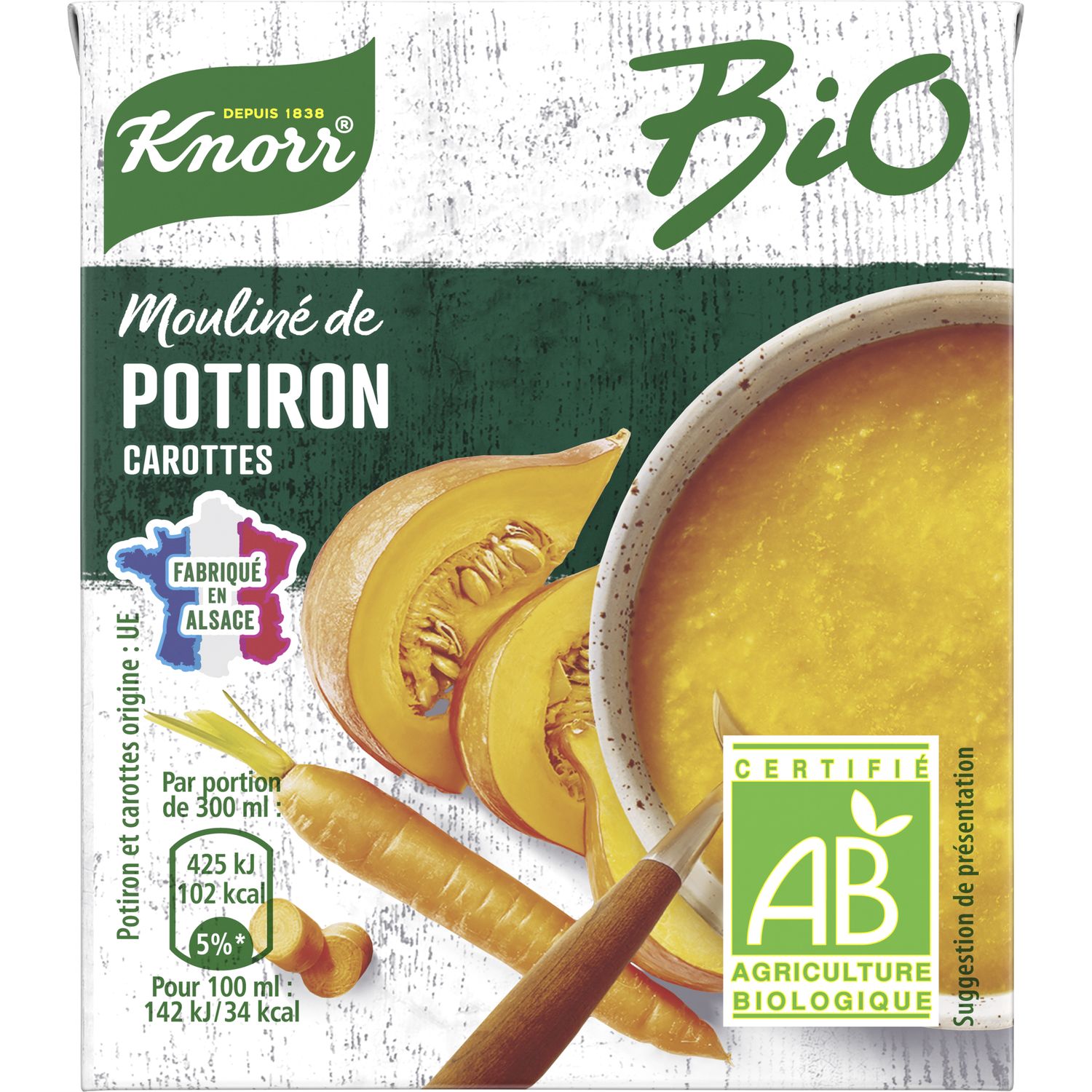 NOTRE RECETTE Ingrédients : eau, potiron¹ : 25%, carotte¹ : 13%, oignon¹, pomme de terre¹, CRÈME fraîche¹, amidon de maïs¹, BEURRE¹, tomate¹, sucre de canne¹, sel, extrait de levure, arômes naturels (dont LAIT), jus de citron concentré¹. ¹Ingrédients issus de l'Agriculture Biologique. Teneur en légumes : 46%.