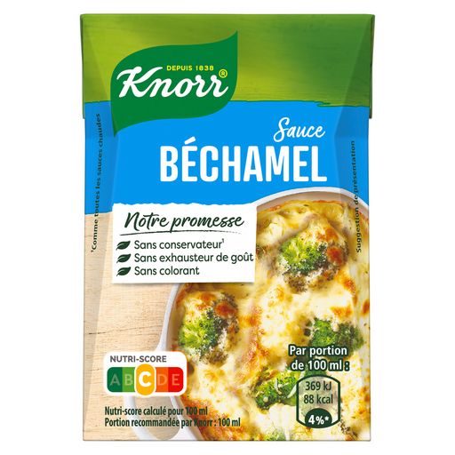La sauce Béchamel à la Noix de Muscade Knorr® en format 2x200ml est une sauce onctueuse qui accompagnera avec délice vos gratins de pommes de terre, de chou-fleur ou de pâtes ainsi que vos lasagnes.