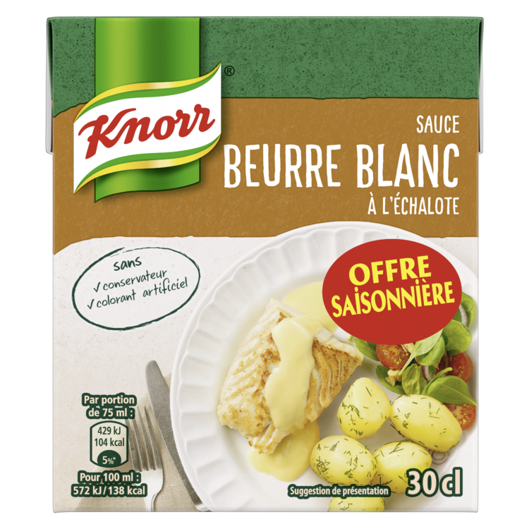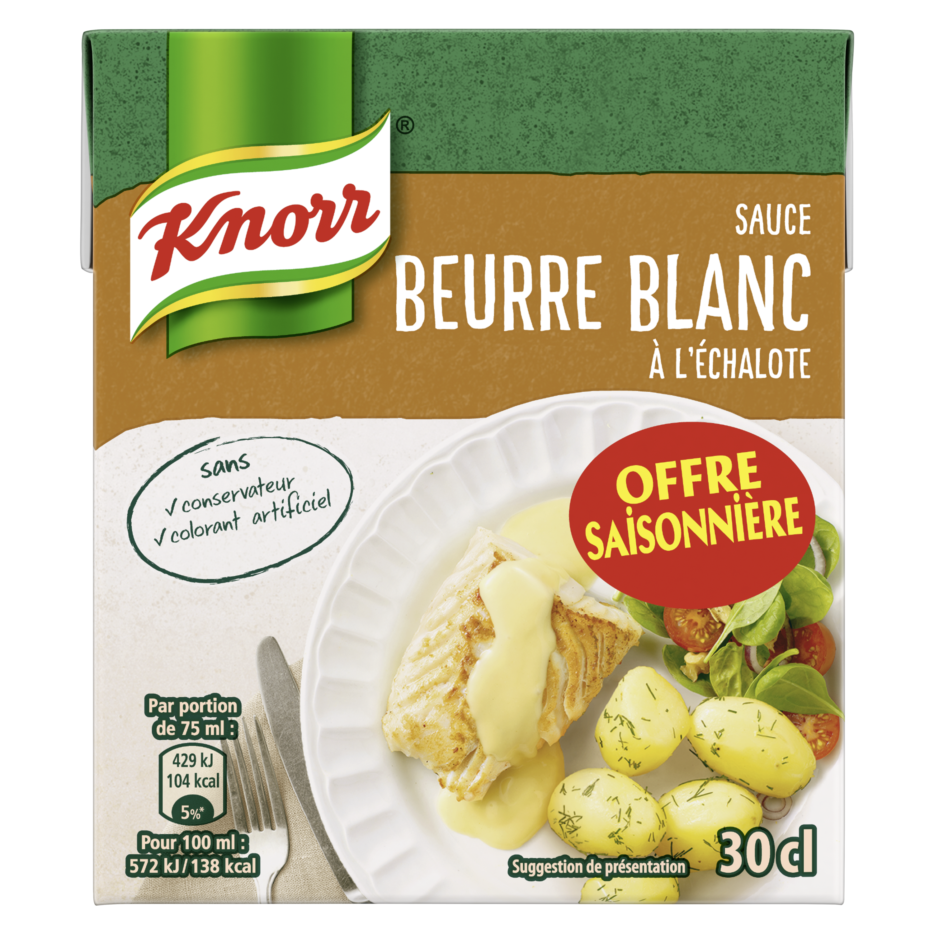 Découvrez la finesse de la sauce au beurre blanc Knorr® délicatement relevé d’échalotes. L’HISTOIRE DE LA MARQUE La meilleure qualité, telle est notre philosophie en matière d’alimentation. Une philosophie appliquée depuis bien des décennies. Notre histoire débute en 1838, lorsque Carl Heinrich Knorr ouvre une usine à Heilbronn, en Allemagne, dont l’activité consiste à fournir de la chicorée aux fabricants de café. Il commence alors à faire des expériences sur la déshydratation des légumes et des assaisonnements afin de préserver leur saveur. C’est ainsi que furent lancées les premières soupes déshydratées Knorr dans toute l’Europe continentale, en 1873. Une découverte qui a ouvert la voie du progrès. En 1889 a été lancée une soupe aux pois, et en 1908 notre mélange pour sauces, une véritable prouesse à l’époque, sur le marché européen. La créativité et l’esprit d’innovation ont toujours animé nos chefs. SAVEURS DU MONDE Les produits Knorr sont présents dans de nombreux pays, aux quatre coins de la planète. Nous sommes très fiers de la perception authentique des saveurs locales que nous avons acquise, pour vous offrir des produits au goût remarquable et vous aider à goûter les saveurs authentiques d’autres cultures. En 1957, les produits vedettes de la marque Knorr, comme le bouillon en cube et les soupes, étaient vendus dans huit pays et en 2000, les produits Knorr se vendaient dans près de 90 pays partout dans le monde. Cette même année a marqué un tournant dans l’histoire de la marque, lorsque Knorr a rejoint la famille Unilever. Sauce Beurre Blanc.