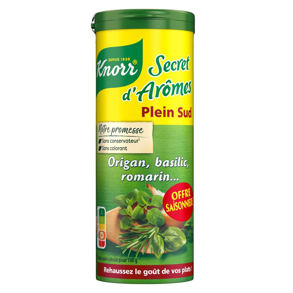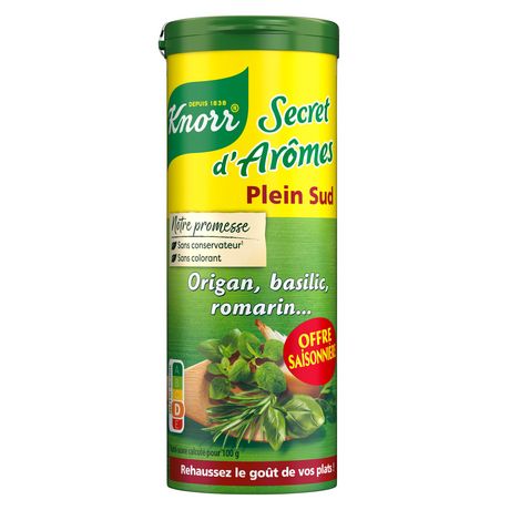 Tous champions du Barbecue avec Knorr®, partenaire officiel de l'UEFA WOMEN'S EURO 2025™. Craquez pour l'assaisonnement en poudre Secret d'Arômes® Plein Sud en édition limitée UEFA WOMEN'S EURO 2025™* ! *Le visuel de l'emballage du produit livré peut différer (soit l'édition permanente, soit l'édition limitée) selon la disponibilité / les arrivages. Le format du produit reste inchangeable. L'assaisonnement en poudre Knorr Secret d'Arômes ® Plein Sud en tube de 60 g est un mélange d'herbes et d'épices méditerranéennes, des aromates préservant toutes leurs saveurs naturelles. Ce mélange d'herbes aromatiques apportera une touche de saveurs méditerranéennes à tous vos plats. Il vous permettra de twister vos salades, vos brochettes de viandes ou encore vos plats en sauces. Préparé sans conservateur et sans colorant artificiel, il deviendra rapidement un incontournable de votre cuisine ! Réveillez vos préparations en quelques minutes : saupoudrez Secret d'Arômes® Plein sud de Knorr® en fin de cuisson ou directement dans l'assiette et laissez parler les épices. Découvrez également nos assaisonnements en poudre Knorr® Secret d'Arômes Tex Mex et Duo Aromatique : des goûts qui s'adaptent à toutes vos envies ! Découvrez les autres bouillons et aides culinaires Knorr® qui vous permettront de rehausser vos plats, vos potages et vos soupes. Le secret pour des plats parfaitement assaisonnés, ils deviendront vite votre secret pour une cuisine toujours plus savoureuse.