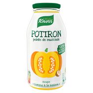 Notre soupe Knorr & La Potagère cuisinée avec du potiron et une pointe de muscade. Elle est conservée dans une bouteille en verre, préservant ainsi toute la fraîcheur et la qualité de ses ingrédients.