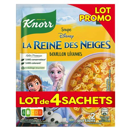 Produit acheté avec une offre promotionnelle. Bouillon de légumes assez basique mais les pâtes reines des neiges font toutes la différence mes filles ( 4 et 2 ans ) la mange avec plaisir.