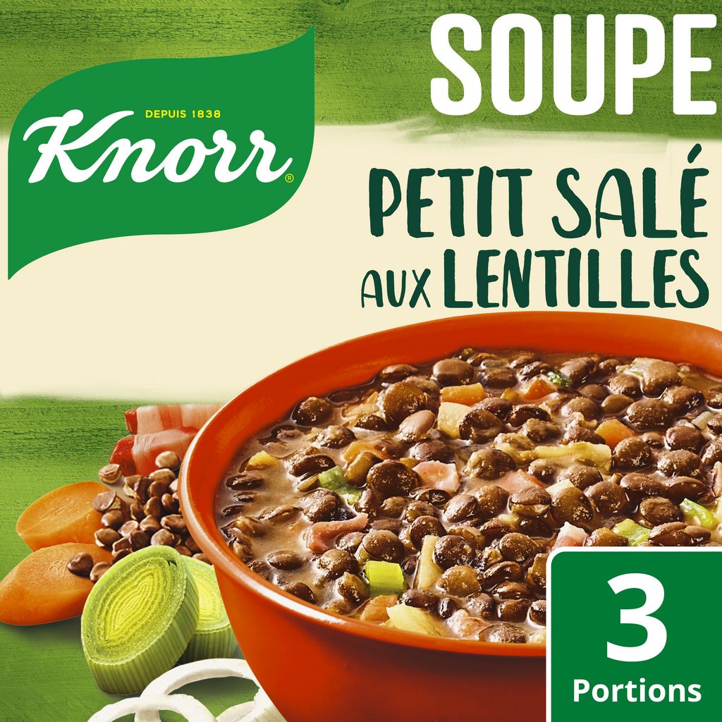 Découvrez la soupe déshydratée Petit Salé aux Lentilles Knorr®, une soupe généreuse agrémentée de lentilles et de morceaux de lard fumé.