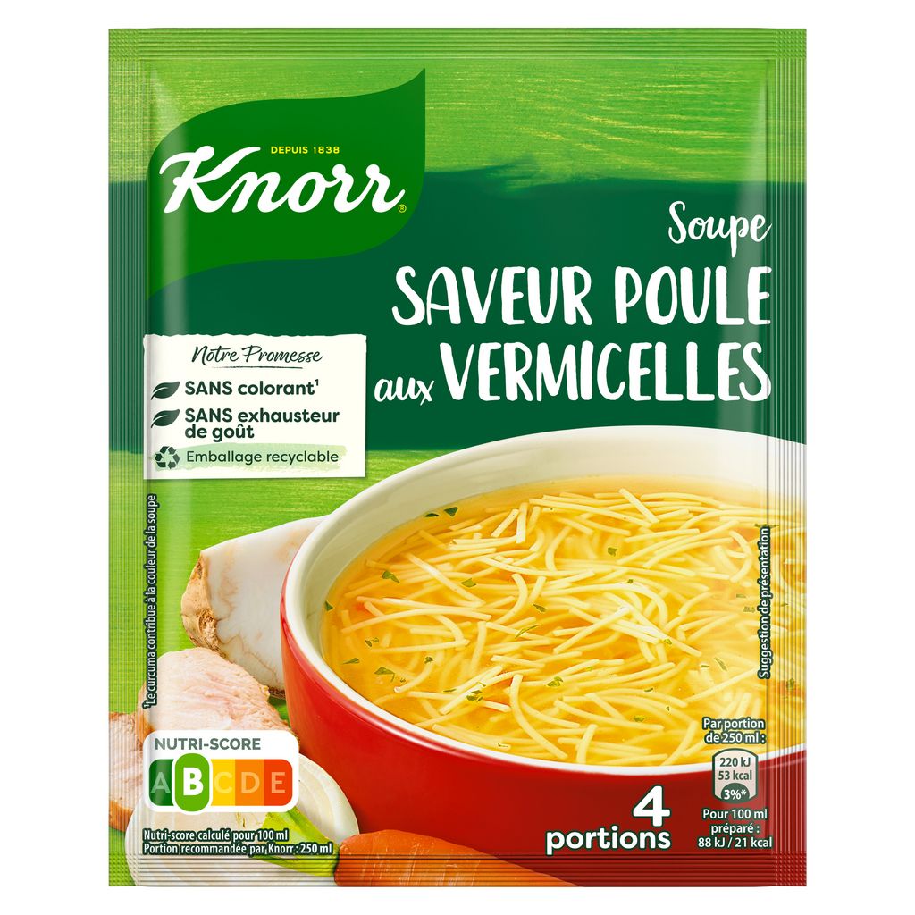 Ingrédients : vermicelle : 70% (semoule de BLÉ dur, farine de BLÉ), amidon de pomme de terre, sel, arômes, sucre, graisse de poule (graisse de poule, antioxydant : extraits de romarin), chlorure de potassium, protéines végétales hydrolysées, extrait de levure, oignon² : 0,5%, CÉLERI-RAVE² : 0,3%, carotte² : 0,3%, épice et aromate (feuilles de CÉLERI, curcuma²), préparation à base de viande de poule (viande de poule : 0,2%, sel, antioxydant : extraits de romarin), jus d'oignon concentré² : 0,06%, huile de tournesol. Peut contenir : autres céréales contenant du gluten, lait, moutarde, œuf, soja. ²Ingrédients issus de l'agriculture durable : 1,3%.