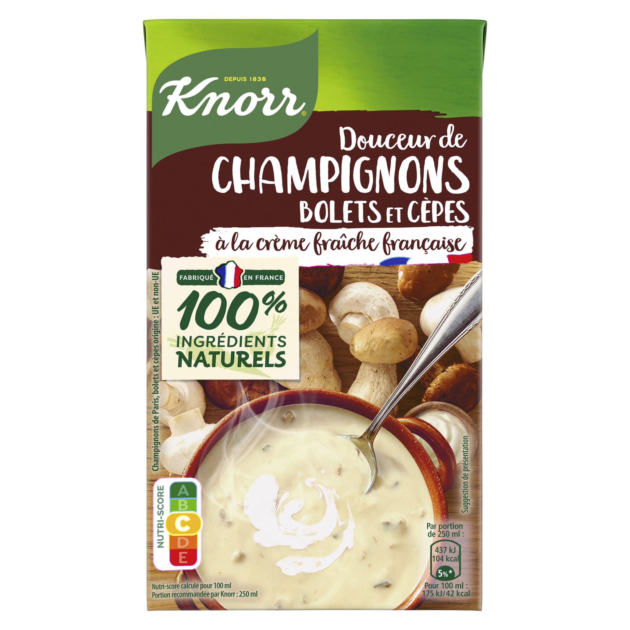 Découvrez la soupe Douceur Champignons, Bolets et Cèpes Knorr®, qui associe le bon goût des champignons à la douceur de la crème fraîche, pour vous offrir un moment délicieusement gourmand. Elle est idéale pour des repas riches en saveurs. Une soupe en brique cuisinée avec 100% d'ingrédients naturels et des légumes issus de l'agriculture durable, pour un repas simple et riche en goût. Cette soupe végétarienne est préparée sans exhausteur de goût, sans colorant et sans conservateur (comme toutes les soupes liquides au rayon ambiant). Nos briques, majoritairement recyclables et certifiées par les labels FSC® et ASI®, soutiennent l'approvisionnement durable en carton et en aluminium. Ce format 1 L vous permet de réaliser 4 généreux bols de soupe. Une recette de soupe réconfortante facile et rapide à préparer : secouez, versez, réchauffez sans porter à ébullition… et dégustez ! Knorr® œuvre pour un futur alimentaire durable avec ses agriculteurs partenaires. Chez Knorr®, nous sommes convaincus qu'une utilisation responsable des ressources agricoles contribue à vous offrir des soupes de qualité. C'est pourquoi nous faisons le choix de légumes issus de l'agriculture durable et cultivés en plein champ pour vous préparer nos délicieuses soupes. Grâce à nos produits, recettes et conseils, nous souhaitons vous aider à faire des petits changements quotidiens qui font toute la différence.