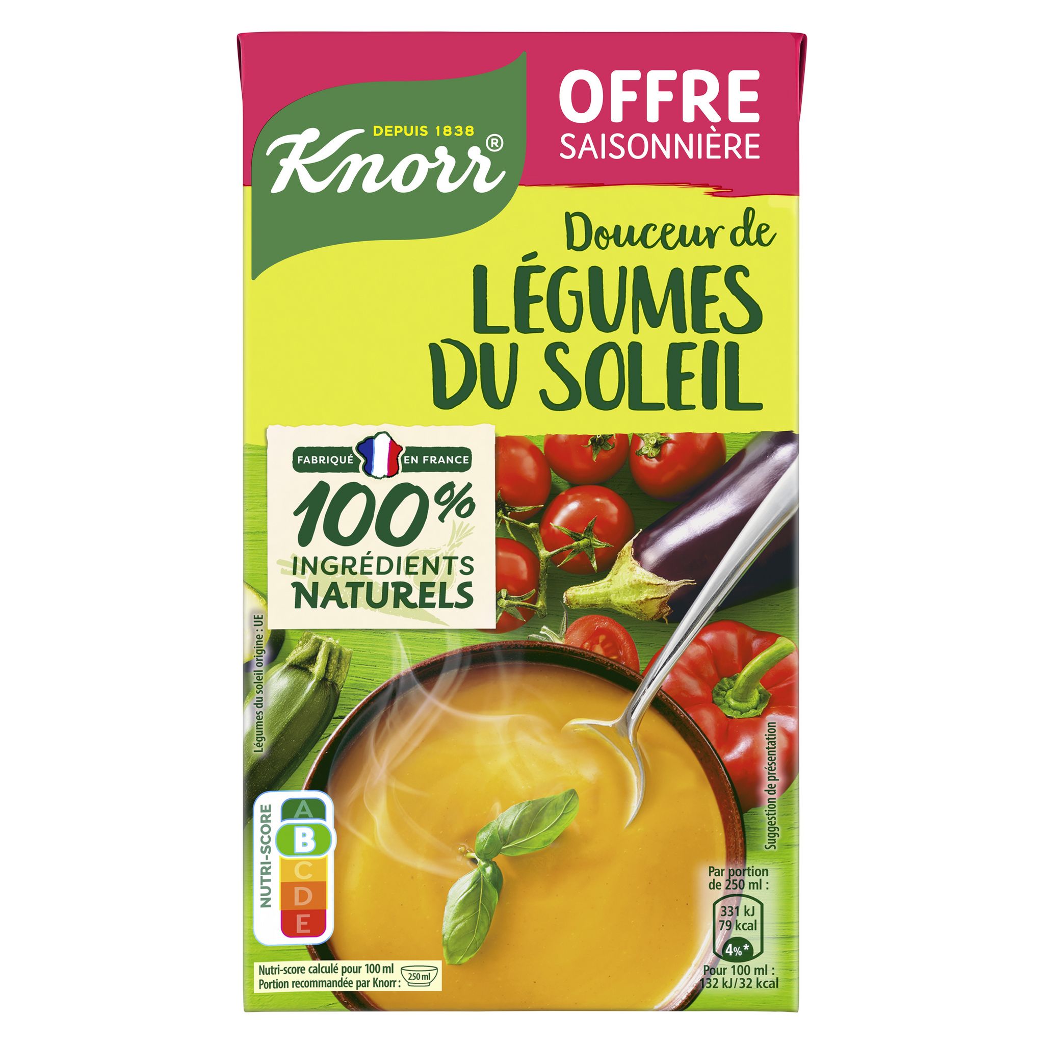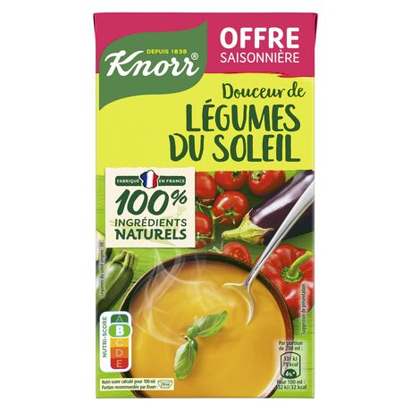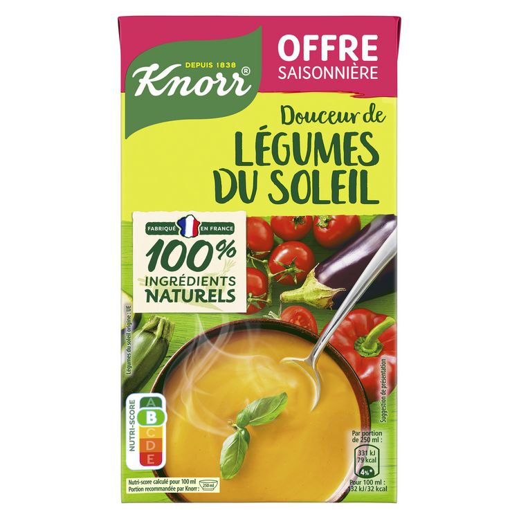 NOTRE RECETTE Ingrédients : eau, tomate¹ : 15%, poivron rouge¹ : 5,3%, carotte¹, courgette¹ : 4,5%, pomme de terre¹, aubergine¹ : 3,4%, CRÈME fraîche, oignon¹ : 2,1%, amidon de maïs, haricot vert¹ : 1,3%, sucre de canne, sel, épices et aromates (ail, racine de livèche¹, poivre, thym¹, origan¹). Peut contenir : céleri, céréales contenant du gluten, moutarde, œuf, soja. ¹Ingrédients issus de l’agriculture durable : 41%. 41% de légumes¹ (incluant la pomme de terre).
