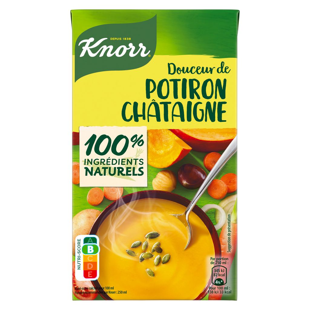 Découvrez la soupe Douceur de Potiron Châtaigne de Knorr®, qui associe la rondeur du potiron à l'onctuosité de la châtaigne pour vous offrir un moment délicieusement gourmand. Une soupe nutri-score B cuisinée avec 100% d'ingrédients naturels et des légumes issus de l'agriculture durable, pour un repas simple et riche en goût. Cette soupe végétarienne et riche en légumes est préparée sans exhausteur de goût, sans colorant et sans conservateur (comme toutes les soupes liquides au rayon ambiant). Nos briques, majoritairement recyclables et certifiées par les labels FSC® et ASI®, soutiennent l'approvisionnement durable en carton et en aluminium. Ce format 1 L vous permet de servir quatre généreux bols de soupe. Une recette réconfortante, facile et rapide à préparer : secouez, versez, réchauffez sans porter à ébullition… et dégustez ! Knorr® œuvre pour un futur alimentaire durable avec ses agriculteurs partenaires. Chez Knorr ®, nous sommes convaincus qu'une utilisation responsable des ressources agricoles contribue à vous offrir des soupes de qualité. C'est pourquoi nous faisons le choix de légumes issus de l'agriculture durable et cultivés en plein champ pour vous préparer nos délicieuses soupes. Grâce à nos produits, recettes et conseils, nous souhaitons vous aider à faire des petits changements quotidiens qui font toute la différence.
