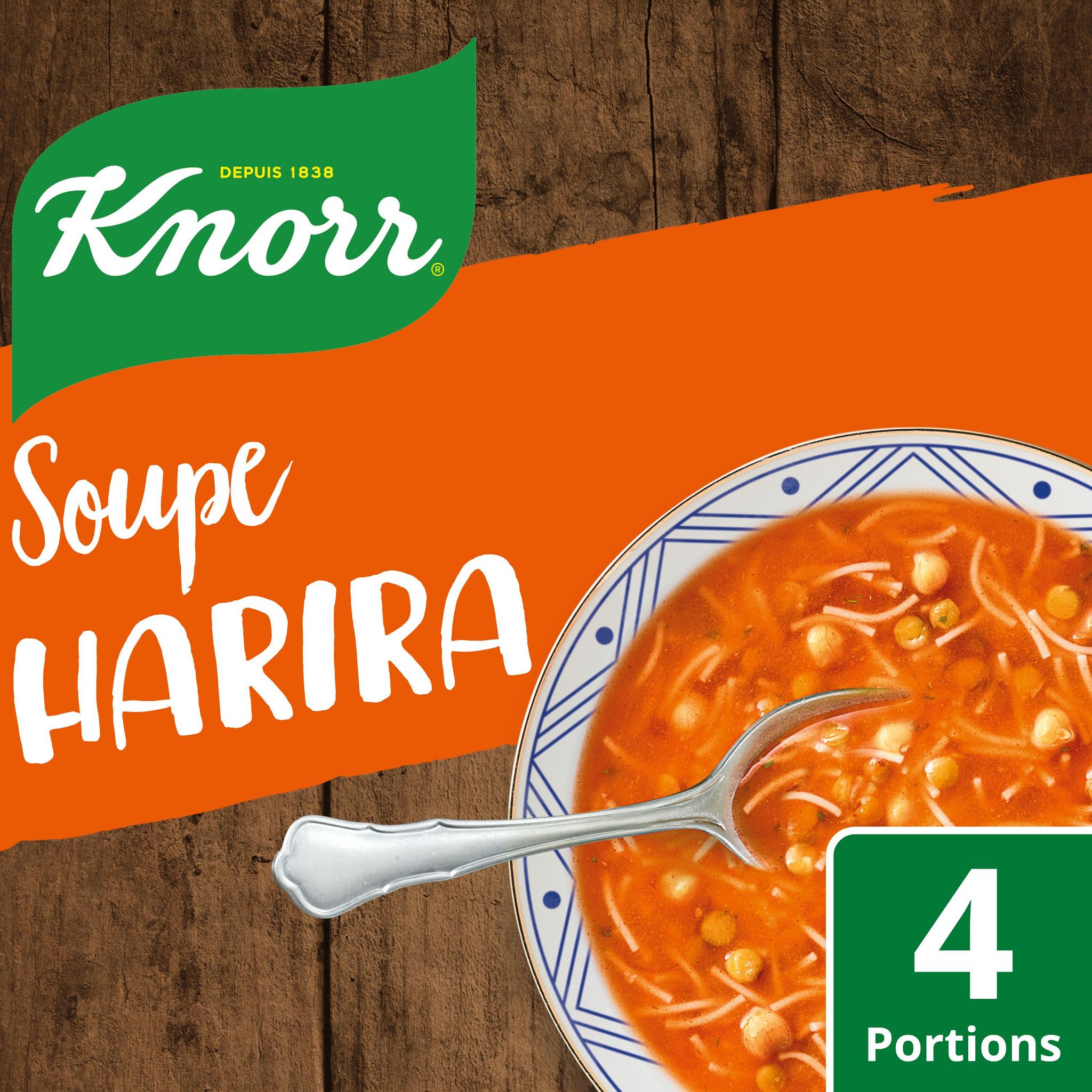 La Harira est une soupe généreuse traditionnelle venue du Maghreb, préparée avec des tomates, des pois chiches, des lentilles et des oignons. Grâce à ses épices orientales, faites un voyage gustatif le temps d'un repas. Découvrez vite ce délicieux potage halal de Knorr ®. Cette soupe déshydratée est concoctée sans colorant et sans exhausteur de goût. La déshydratation est un processus qui consiste à retirer l'eau des ingrédients de nos soupes afin de conserver leur qualité et leur saveur. Une recette de soupe de légumes, de lentilles et de pois chiche savoureuse et réconfortante prête en 8 minutes : versez le contenu du sachet dans 1 L d'eau froide puis portez à ébullition. Laissez mijoter 8 minutes. C'est prêt ! Il ne vous reste plus qu'à déguster. Ce format vous permet de réaliser quatre généreux et délicieux bols de soupe. Knorr® œuvre pour un futur alimentaire durable avec ses agriculteurs partenaires. Chez Knorr®, une utilisation responsable des ressources agricoles contribue à vous offrir des soupes de qualité. C'est pourquoi nous faisons le choix de légumes issus de l'agriculture durable et cultivés en plein champ pour vous préparer nos délicieuses soupes. Grâce à nos produits, recettes et conseils, nous souhaitons vous aider à faire des petits changements quotidiens qui font toute la différence.
