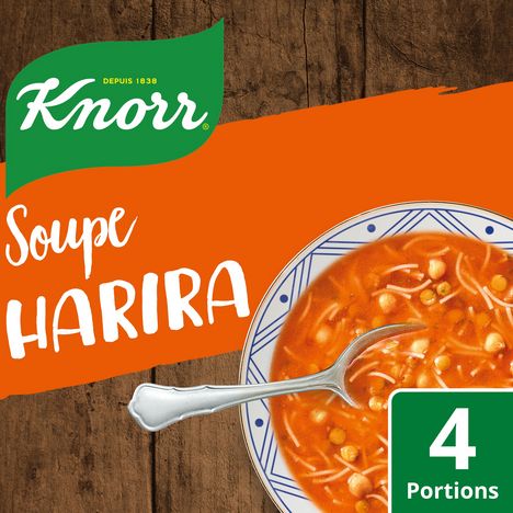 Découvrez la soupe déshydratée Harira Halal Knorr®, une soupe généreuse traditionnelle venue du Maghreb, préparée avec des tomates, des pois chiches, des lentilles et des oignons.