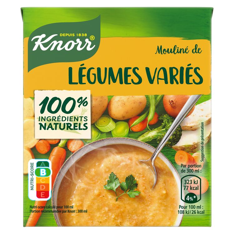 Les recettes Knorr®, c’est toute la saveur du potager au quotidien, dans des soupes de légumes préparées par nos chefs avec de délicieux ingrédients issus de l'agriculture durable. Cette délicieuse recette combine pomme de terre, céleri-rave, oignon, haricot vert, brocoli, poireau, épinard, cresson et carotte. Elle a été préparée sans exhausteur de goût et sans colorant. Nos soupes liquides au rayon ambiant sont portées à haute température afin que leur qualité soit préservée sans ajout de conservateur. Rapide et facile à préparer, cette soupe Knorr® Mouliné de Légumes Variés est parfaite pour profiter d'un repas sain et délicieux lorsque vous manquez de temps. Secouez, versez, réchauffez et profitez de sa douceur et de sa chaleur réconfortante. Inutile de saler. Ce format 30 cl vous permet de réaliser 1 généreux bol de soupe.