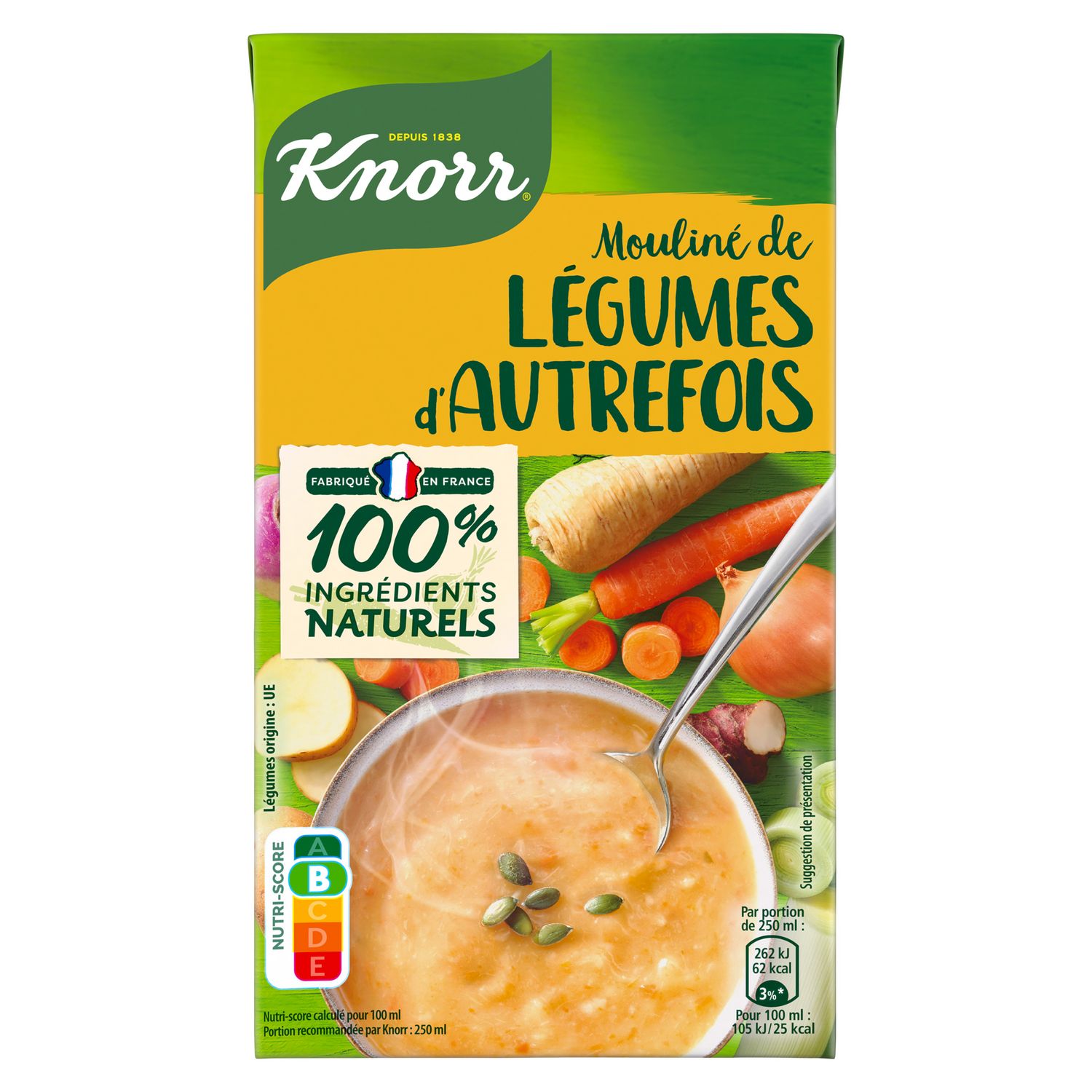 Découvrez la soupe Mouliné de Légumes d'Autrefois de Knorr® : une texture pulpeuse et le bon goût des légumes d'antan. Un régal ! Nutri-score B, elle est idéale pour des repas riches en saveurs. Une soupe cuisinée avec 100% d'ingrédients naturels et des légumes issus de l'agriculture durable, pour un repas simple et riche en goût. Cette soupe végétarienne est préparée sans exhausteur de goût, sans colorant et sans conservateur (comme toutes les soupes liquides au rayon ambiant). Nos briques, majoritairement recyclables et certifiées par les labels FSC® et ASI®, soutiennent l'approvisionnement durable en carton et en aluminium. Ce format 1 L vous permet de servir 4 généreux bols de soupe. Une recette réconfortante, facile et rapide à préparer : secouez, versez, réchauffez sans porter à ébullition… et dégustez ! Knorr® œuvre pour un futur alimentaire durable avec ses agriculteurs partenaires. Chez Knorr ®, nous sommes convaincus qu'une utilisation responsable des ressources agricoles contribue à vous offrir des soupes de qualité. C'est pourquoi nous faisons le choix de légumes issus de l'agriculture durable et cultivés en plein champ pour vous préparer nos délicieuses soupes. Grâce à nos produits, recettes et conseils, nous souhaitons vous aider à faire des petits changements quotidiens qui font toute la différence.