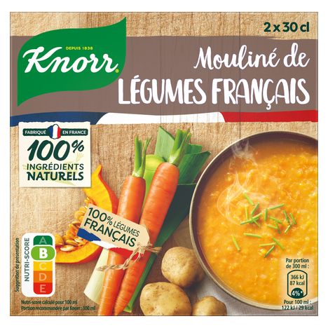 Découvrez la délicieuse soupe mouliné de légumes français de Knorr®, fabriquée en France avec 100% de légumes français ! Récoltés à maturité, ils sont cultivés de façon durable et responsable par nos agriculteurs partenaires. Une soupe nutri-score B cuisinée avec 100% d'ingrédients naturels et des légumes issus de l'agriculture durable, pour un repas simple et riche en goût. Cette soupe végétarienne et riche en légumes est préparée sans exhausteur de goût, sans colorant et sans conservateur (comme toutes les soupes liquides au rayon ambiant). Nos briques, majoritairement recyclables et certifiées par les labels FSC® et ASI®, soutiennent l'approvisionnement durable en carton et en aluminium. Ce format 2 x 30 cl vous permet de réaliser deux généreux bols de soupe. Une recette réconfortante, facile et rapide à préparer : secouez, versez, réchauffez sans porter à ébullition… et dégustez ! Knorr® œuvre pour un futur alimentaire durable avec ses agriculteurs partenaires. Chez Knorr®, nous sommes convaincus qu'une utilisation responsable des ressources agricoles contribue à vous offrir des soupes de qualité. C'est pourquoi nous faisons le choix de légumes issus de l'agriculture durable et cultivés en plein champ pour vous préparer nos délicieuses soupes. Grâce à nos produits, recettes et conseils, nous souhaitons vous aider à faire des petits changements quotidiens qui font toute la différence.
