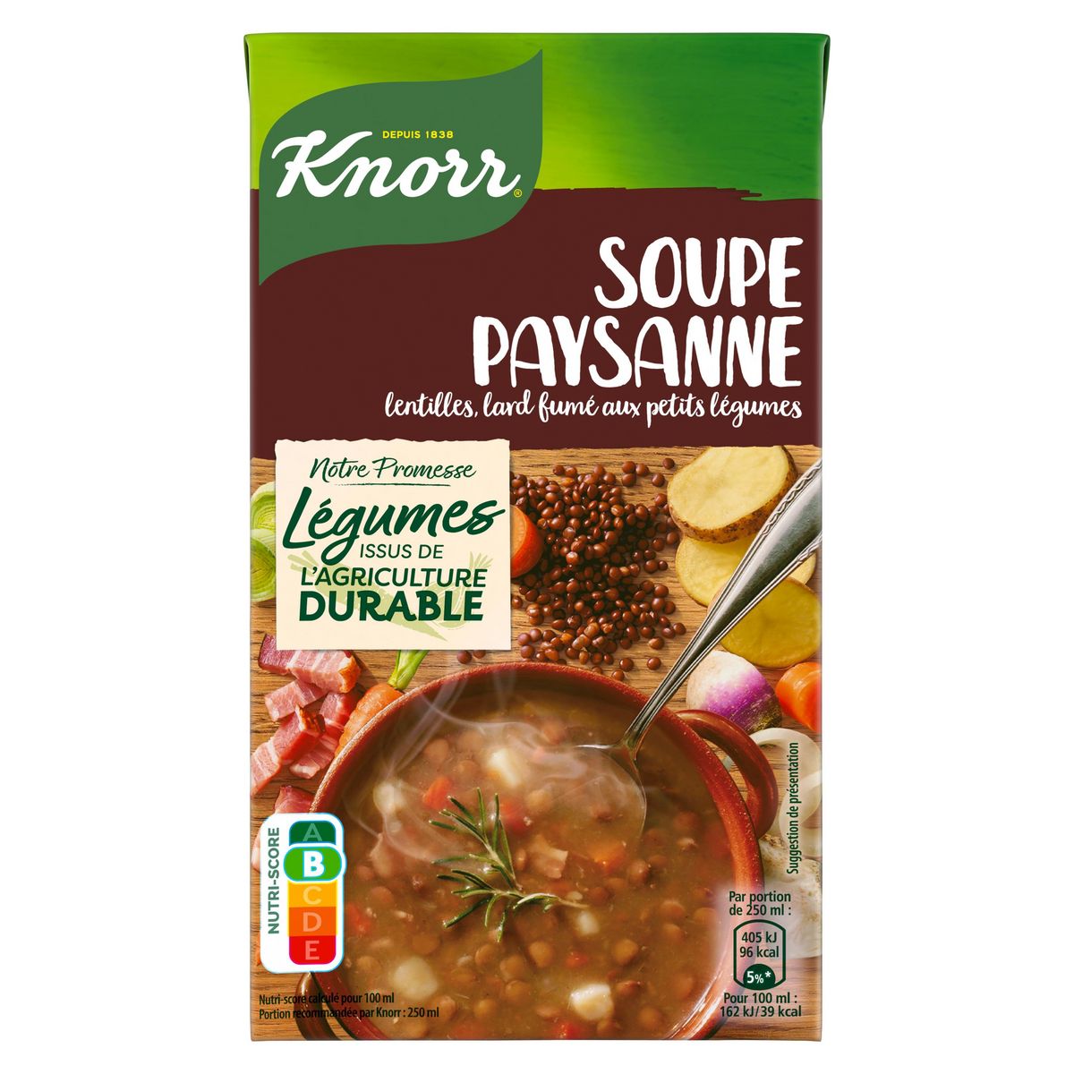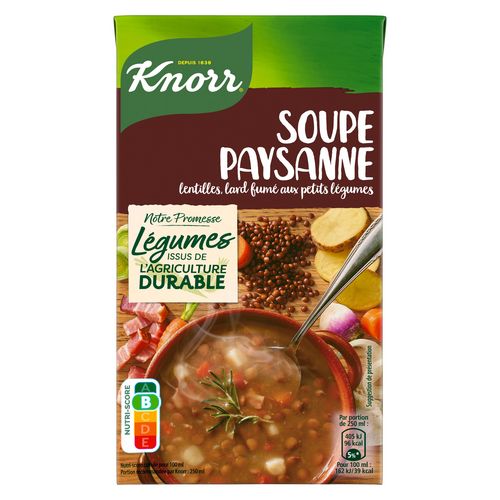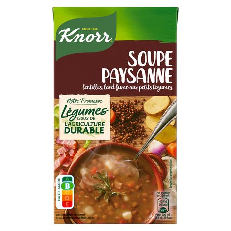 Découvrez la Soupe Paysanne Knorr ® qui allie le bon goût des lentilles, du lard fumé et des petits légumes : un vrai régal ! Redécouvrez les Saveurs d'Antant grâce aux soupes Knorr ® Saveur d'Antan, idéales pour un repas rapide et riche en goût. NutriScore B, elle est la soupe idéale pour des repas riches en saveurs. Une soupe avec des légumes issus de l'agriculture durable pour un repas rapide et riche en goût. Cette soupe est préparée sans exhausteur de goût, sans colorant et sans conservateur (comme toutes les soupes liquides au rayon ambiant). En choisissant la brique Knorr® certifiée par les labels FSC ® et ASI ®, vous prenez soin de notre planète ! En effet, les briques Knorr® soutiennent l'approvisionnement responsable en aluminium et leur carton est issu de forêts gérées durablement et d'autres sources contrôlées. Ce format 1?L vous permet de réaliser 4 généreux bols de soupe au bon goût de légume. Une recette de soupe réconfortante facile et rapide à préparer : secouez, versez, réchauffez sans porter à ébullition… et dégustez ! Knorr® travaille pour un futur alimentaire durable pour vous et la planète. Grâce à nos produits, recettes et conseils, nous souhaitons vous aider à faire des petits changements quotidiens qui font toute la différence. Ensemble construisons un meilleur futur alimentaire !