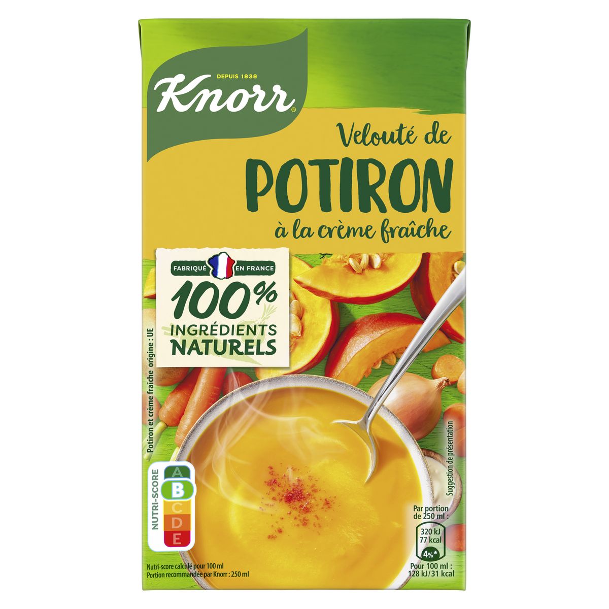 NOTRE RECETTE Ingrédients : eau, potiron¹ : 17%, carotte¹ : 16%, courge¹ : 9,5%, pomme de terre¹ : 3,9%, oignon¹ : 3,9%, CRÈME fraîche : 1,8%, BEURRE, tomate¹, sel, sucre de canne, racine de livèche¹. Peut contenir : céleri, céréales contenant du gluten, moutarde, œuf, soja. ¹Ingrédients issus de l'agriculture durable : 51%. 51% de légumes¹ (incluant la pomme de terre).