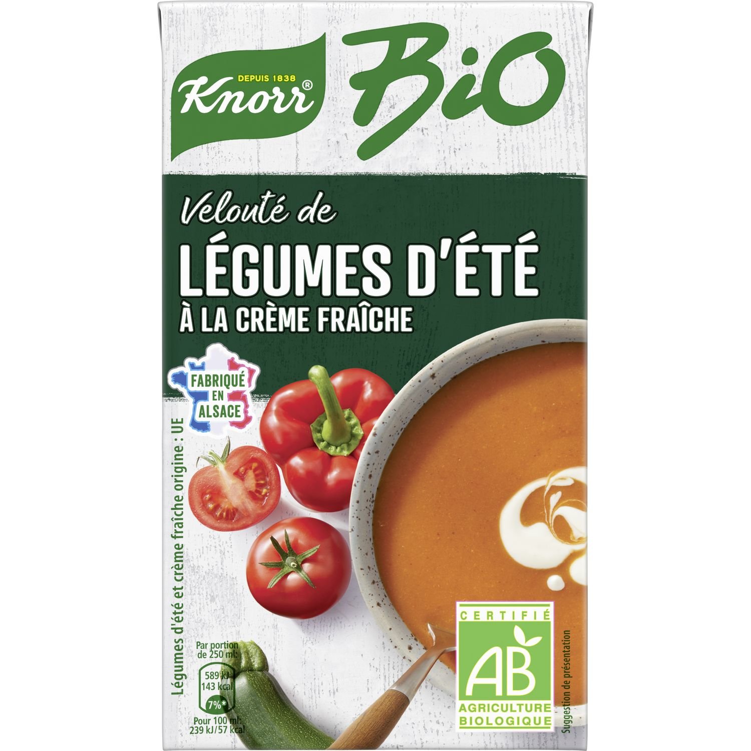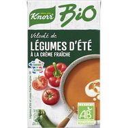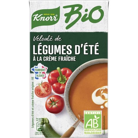 Soupe. Retrouvez tout le savoir-faire des chefs Knorr® et le bon goût de légumes issus de l'agriculture biologique dans ce délicieux Velouté de Légumes d'été cuisiné par les chefs Knorr® et fabriqué en Alsace. Toujours naturel, biologique et adapté pour les végétariens. La meilleure qualité possible, telle est notre philosophie en matière d’alimentation. Depuis la création de Knorr® par Carl Heinrich Knorr en Allemagne en 1838, tous nos efforts visent à créer des recettes originales et des plats savoureux. Notre histoire est faite de milliers de petites anecdotes d’agriculteurs, de fournisseurs et de chefs passionnés qui tentent de rendre le monde meilleur et plus savoureux. Tous s’impliquent pour que l’ensemble de nos légumes soit cultivé selon les principes de l’agriculture durable. Il s’agit là d’une approche favorable pour la planète et qui, nous en sommes certains, influence le goût et les saveurs de chaque plat que vous mijotez. Quelles que soient vos envies, Knorr® vous accompagne au quotidien. Venez découvrir notre soupe liquide bio Légumes d'été dans une brique de 1 litre. Vous pouvez aussi découvrir d'autres saveurs, avec la soupe en brique bio Mouliné de Potiron Carottes.
