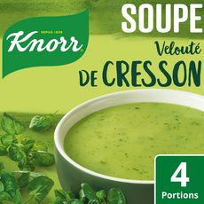 Grâce au délicieux Velouté de Cresson de Knorr ®, retrouvez toute la saveur parfumée et légèrement piquante du cresson dans cette délicieuse soupe déshydratée ! Cette soupe Nutri-score B végétarienne est préparée sans colorant et sans conservateur. Ce format vous permet de réaliser 4 bols de soupe. Une recette de potage réconfortante prête en 5 minutes : versez le contenu du sachet dans 1 L d'eau froide puis portez à ébullition. Laissez mijoter 5 min. C'est prêt ! La gamme de soupes économiques Knorr® marie de délicieux légumes pour vous offrir des classiques de la soupe à un prix accessible ! Retrouvez également dans cette gamme : Knorr ® Soupe Crème d'Asperge pour 4 personnes 70 g, Knorr ® Soupe saveur Poule aux vermicelles pour 4 personnes 63 g, Knorr ® Soupe Tomates aux vermicelles pour 4 personnes 67 g... Dans son sachet recyclable, cette soupe déshydratée est préparée sans colorant ni exhausteur de goût. Savez-vous ce qu'est la déshydratation ? Contrairement aux idées reçues, la déshydratation existe depuis la nuit des temps : c'est l'une des plus anciennes méthodes de préservation des aliments ! Une soupe déshydratée est une soupe constituée d'ingrédients déshydratés réduits en poudre. Les matières premières sont les mêmes que dans une soupe traditionnelle à cuire, mais elles ont reçu un traitement spécial afin de retirer l'eau qu'elles contiennent. Carl Heinrich Knorr®, fondateur de la marque Knorr®, fut l'un des premiers à intégrer ce procédé dans la fabrication de ses soupes, il y a plus de 175 ans. Knorr® travaille pour un futur alimentaire durable pour vous et la planète.