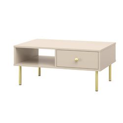 La table basse de la série Venus est un élément élégant et pratique de la décoration du salon. Fabriqué à partir de panneaux de meubles en cachemire, c'est une combinaison de beige subtil avec des gris délicats, donnant au meuble un aspect délicat et sobre, ce qui le rend parfaitement assorti à différents styles d'intérieur, du moderne au plus altique. Equipé d'un tiroir, c'est une solution parfaite pour ceux qui apprécient également les solutions pratiques. Le tiroir peut servir à ranger des bibelots, des télécommandes, ou encore des magazines, grâce à quoi la table sert également d'espace de rangement. Les pieds dorés de la table basse lui confèrent un caractère raffiné et un aspect luxueux. La finition dorée attire l'attention et donne au meuble un éclat exclusif.