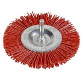 Brosse plate avec fils corindon pour un travail plus fin que les fils métalliques. Pour enlever la peinture et nettoyer le bois et le métal. Se monte sur une perceuse.Diamètre brosse : 75 mmDiamètre tige : 6 mm