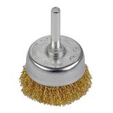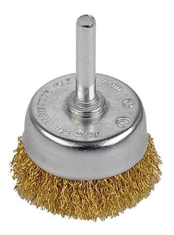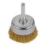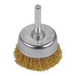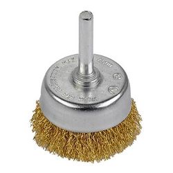 Brosse soucoupe avec fils ondulés en acier laitonné. Le revêtement en cuivre protège de l&rsquo,oxydation. Pour enlever la rouille, la peinture, le ciment sur le bois, le métal, la pierre. Se monte sur une perceuse.Diamètre brosse : 50 mmDiamètre tige : 6 mm