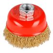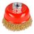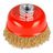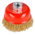 Brosse soucoupe avec fils ondulés. Le revêtement en cuivre protège de l&rsquo,oxydation. Pour enlever la rouille, la peinture, le ciment sur le bois, le métal, la pierre. Se monte sur meuleuse.Diamètre brosse : 75 mmAxe : M14