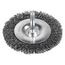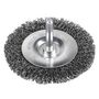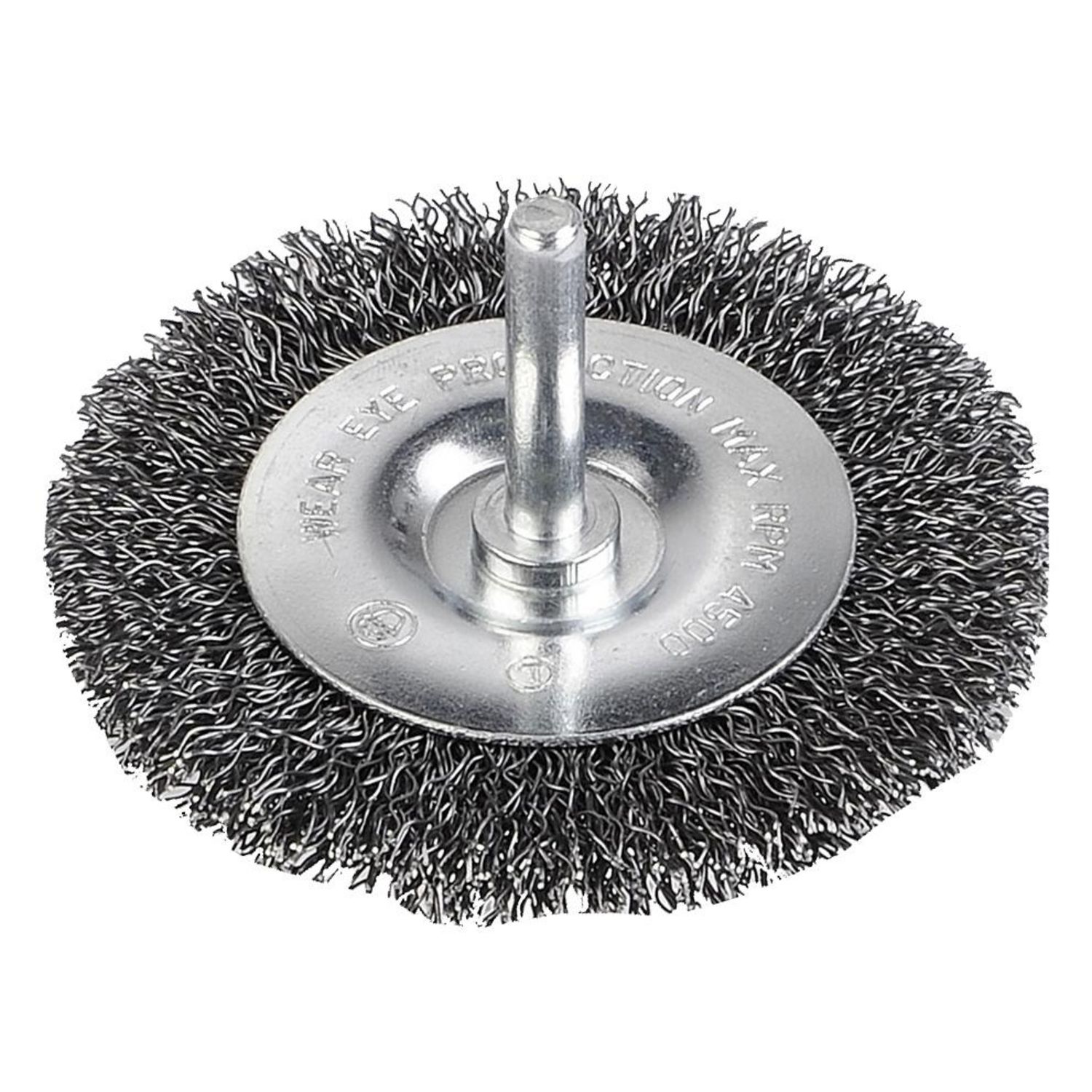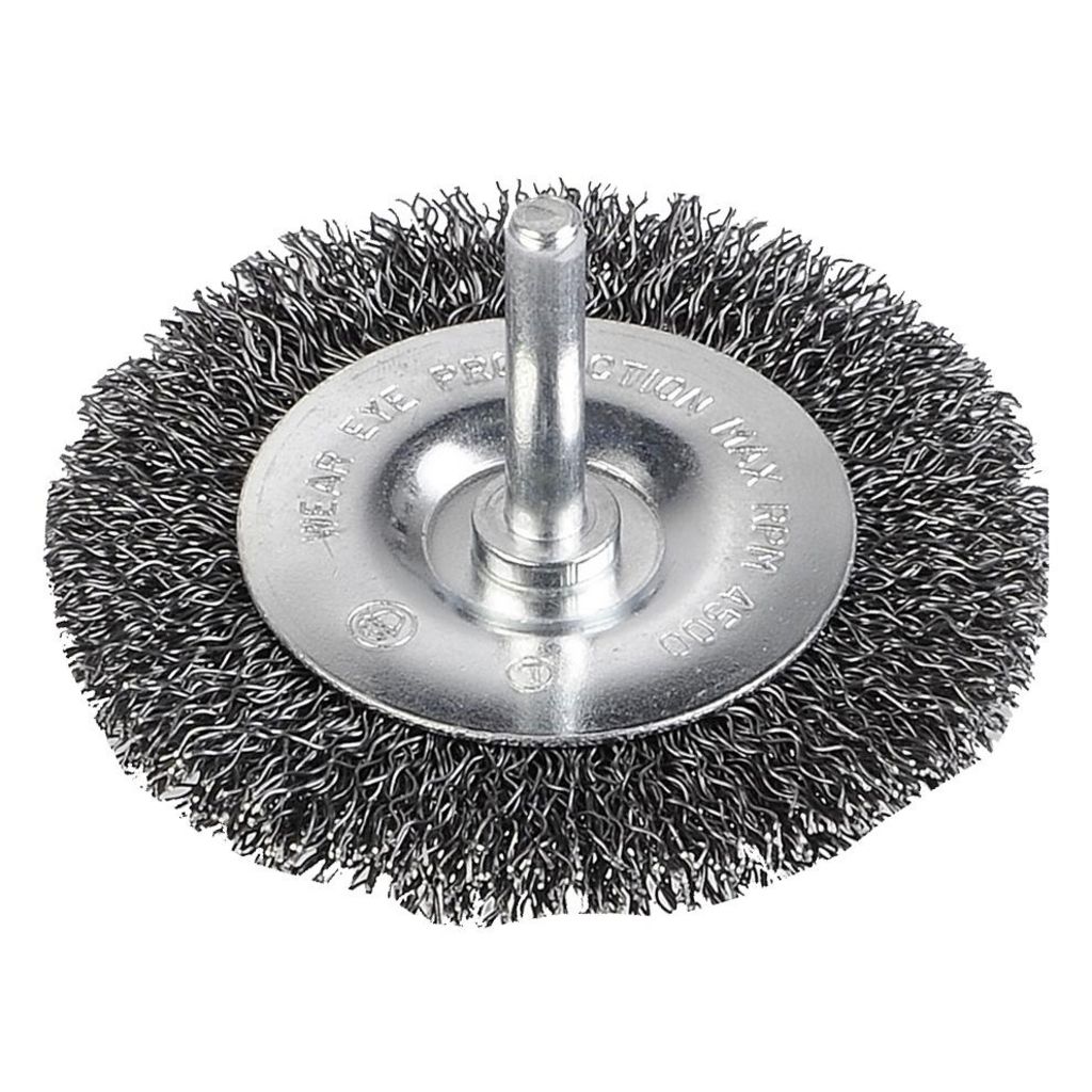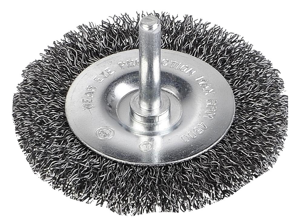 Brosse plate avec fils ondulés en acier. Pour enlever la rouille, la peinture, le ciment sur le bois, le métal, la pierre. Se monte sur une perceuse.Diamètre brosse : 100 mmDiamètre tige : 6 mm