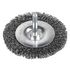 Brosse plate avec fils ondulés en acier. Pour enlever la rouille, la peinture, le ciment sur le bois, le métal, la pierre. Se monte sur une perceuse.