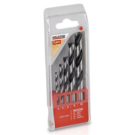 Forets à bois Kréator en coffret de 5 mèches.Coffret 5 mèches : Diamètres 4, 5, 6, 8 et 10 mm