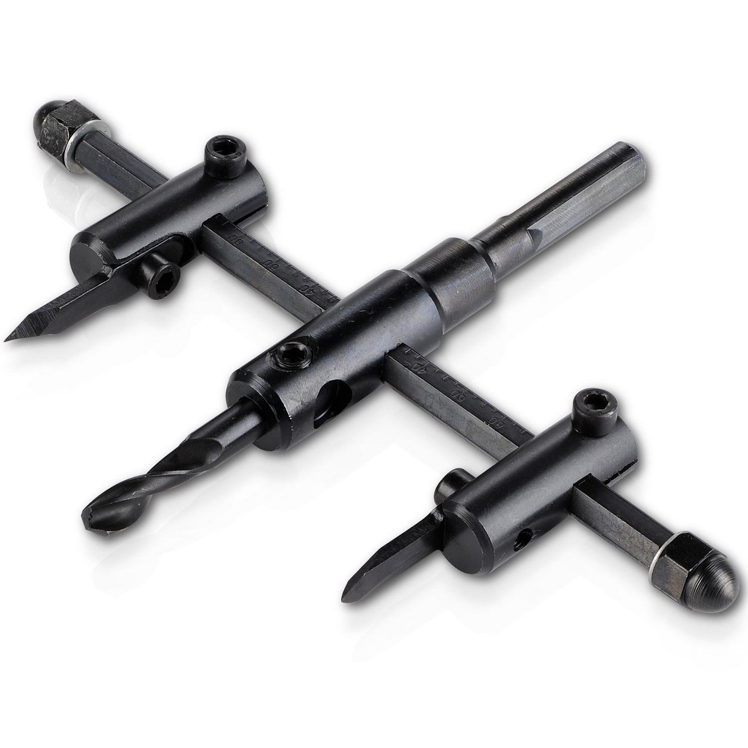 Mèche de centrage au milieu de l'outil, et deux couteaux réglables montés sur un axe.
