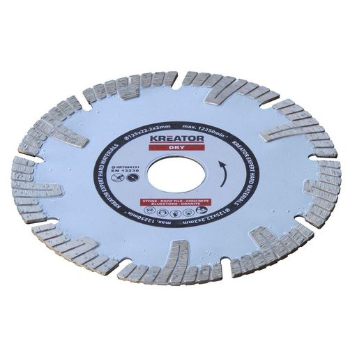 Disque diamant béton armé - Alésage 22,2 mm 1 disque 125 mm 2,0 mmDisques à segments pour la coupe des matériaux les plus durs : béton armé, pierre de taille, granit, etc. Utilisation à sec. Hauteur des segments : 10 mm. Se montent sur les meuleuses.