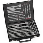 Contenu de la malette:1 Burin pointu de type SDS-plus: 14x14 mm1 Burin pointu de type SDS-plus: 13x247 mm1 Burin plat de type SDS-plus: 20x143 mm1 Burin plat de type SDS-plus: 20x247 mm1 Burin plat de type SDS-plus: 40x247 mm1 Mèche de type SDS-plus: Ø 5 mm / 110m1 Mèche de type SDS-plus: Ø 6 mm / 1