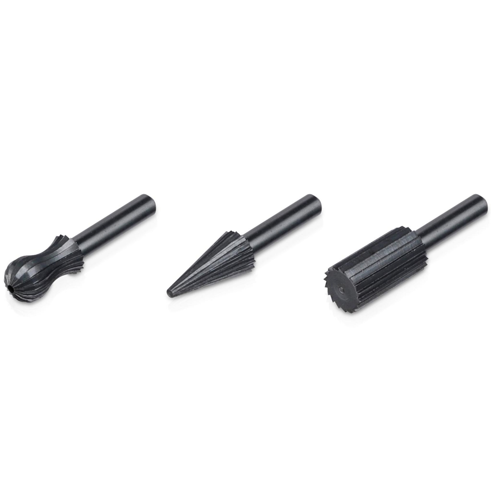 Jeu de 3 râpes Kreator bois et métal pour perceuse comprenant:1 râpe cylindrique1 râpe conique1 râpe sphériqueDiamètre de l'axe: 6mm